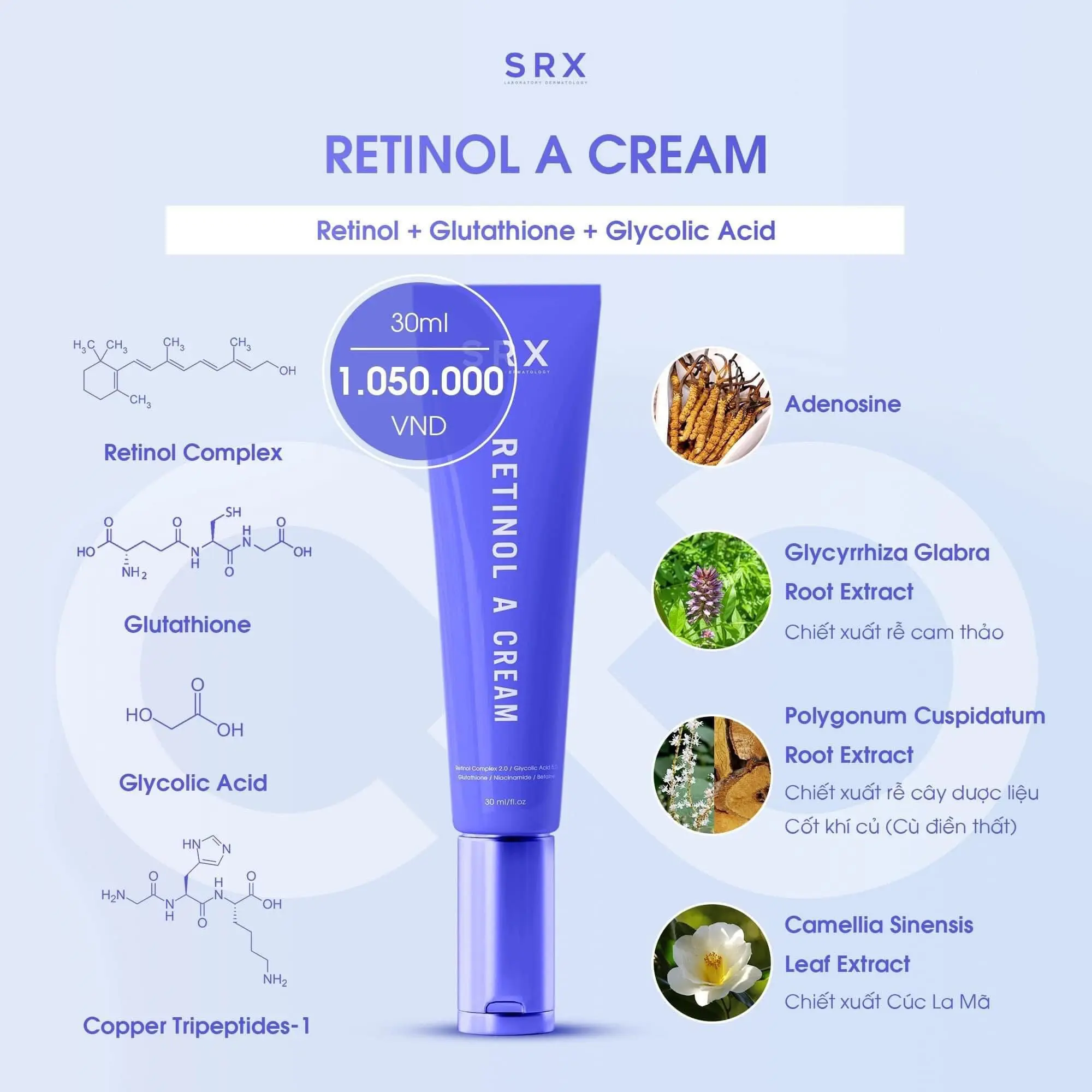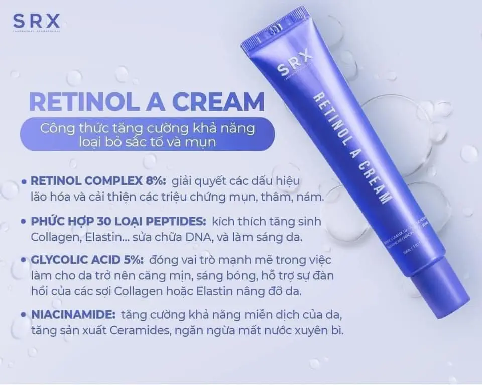 - Retinol Complex 8%: là một trong những thành phần mạnh mẽ nhất để giải quyết các dấu hiệu lão hóa và cải thiện các triệu chứng mụn, thâm, nám.