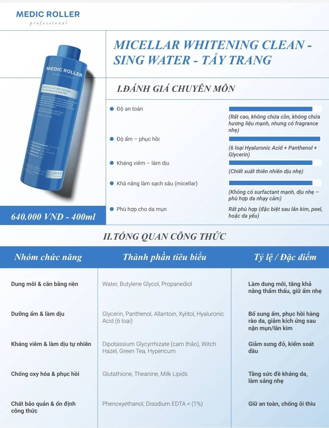 Với công nghệ micellar hiện đại kết hợp thành phần dưỡng ẩm, nước tẩy trang Medic Roller 400ml không chỉ giúp làm sạch mà còn bảo vệ hàng rào tự nhiên của da. Đây là lựa chọn lý tưởng cho cả chăm sóc cá nhân và sử dụng trong spa chuyên nghiệp.