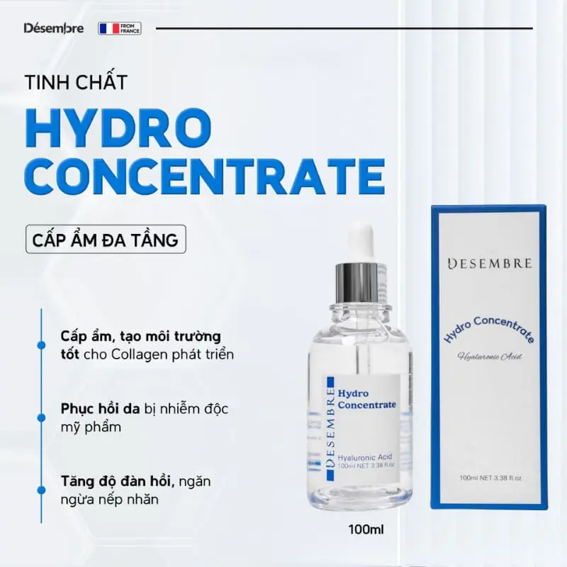 Tinh chất HA cấp ẩm Desembre 100ml (Hydro Concentrate / Hydro Science) là serum chuyên sâu giúp cấp nước – giữ ẩm – phục hồi da – tăng độ đàn hồi, được sử dụng rất phổ biến trong spa.